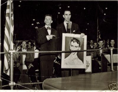 This page is for a very unusual Sinatra collectable. At a charity auction,Times Square, NYC. Frank auctioned off and signed the front of this portrait of himself. All the information and the photo documention are included with this, sure to be the hi-lite of your collection. The night of the auction this piece sold for $4,000 to the lucky highest bidder. The winner was in the restaurant business, and was from Sweden.Thats where this painting has been since the early 50's. Over 50 years abroad. I have brought it back to the US where it belongs.